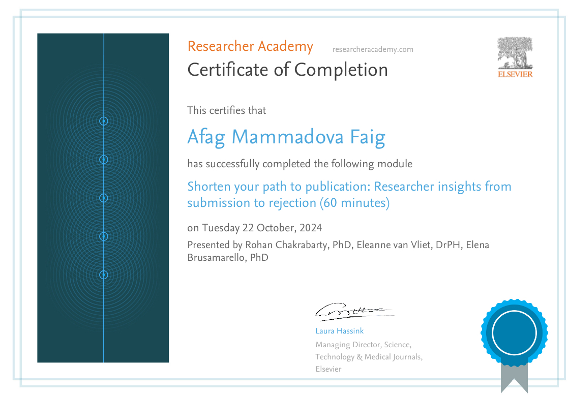 33 elmi məqalənin və konfrans materiallarının müəllifidir, onlardan 9-u Web of Science, 11-i isə SCOPUS Q2 və Q3 kateqoriyalı elmi-biblioqrafik bazasında indeksləşib və əsərlərin hər biri Google.scholar.com axtarış sistemində yer alır.